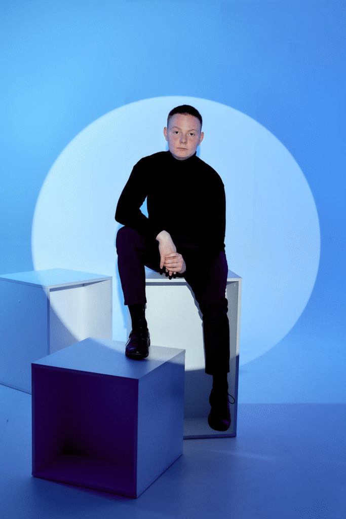 This photoshoot surrounds the birthday boy with vibrant blue balloons.