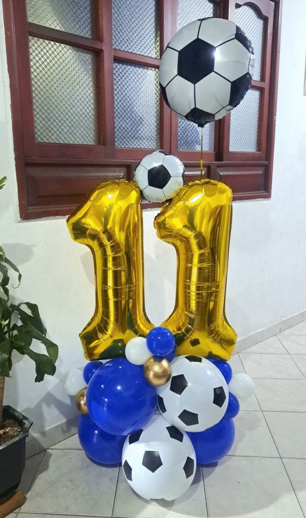 This fun theme uses black‑and‑white soccer balloons.