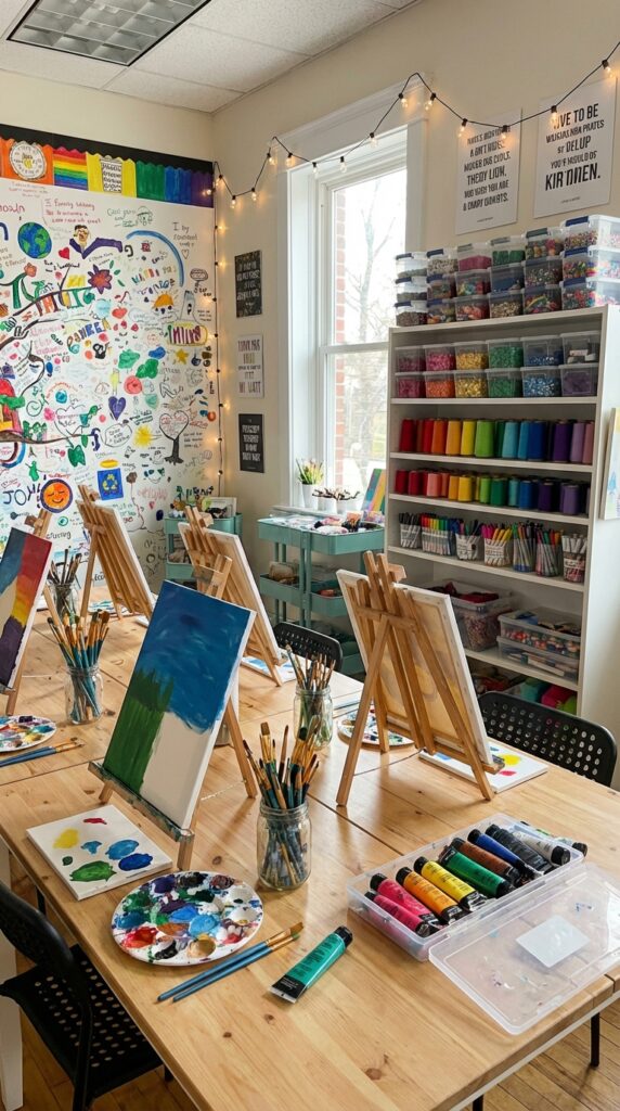 Set up a craft supply station with paints, canvases, beads, and fabric markers. You’ll want to include a collaborative project like a group mural where everyone contributes their unique style.