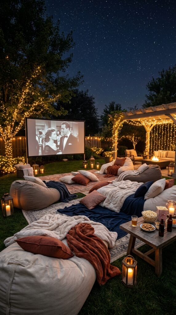 Change your yard into a cozy cinema by setting up an outdoor projector against a white sheet or wall. Spread out plenty of cozy blankets, pillows, and bean bags for comfortable seating.