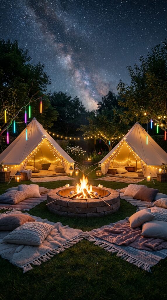 Set up cozy tents decorated with glow sticks and string lights for a magical starry night atmosphere.