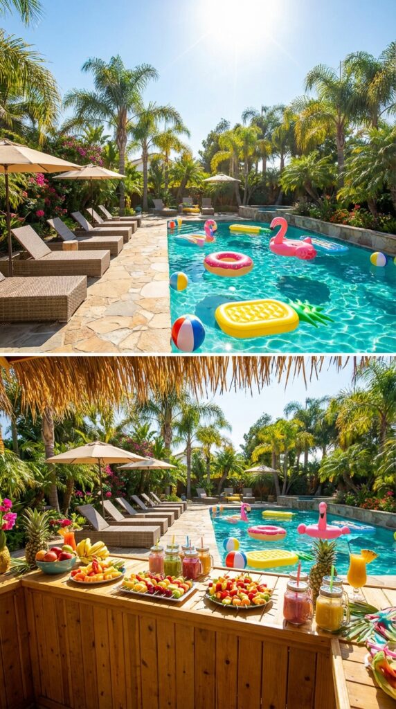 Don’t forget floating decorations and beach balls to complete your poolside paradise theme.