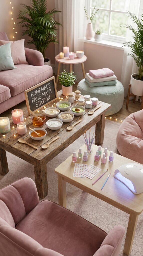 You’ll want to set up stations for homemade face masks using natural ingredients like honey and yogurt.
