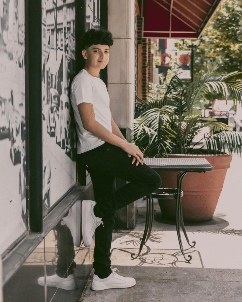 A stylish portrait featuring a boy dressed in black, creating a sleek and confident appearance. The monochromatic look adds a mature and fashionable vibe.