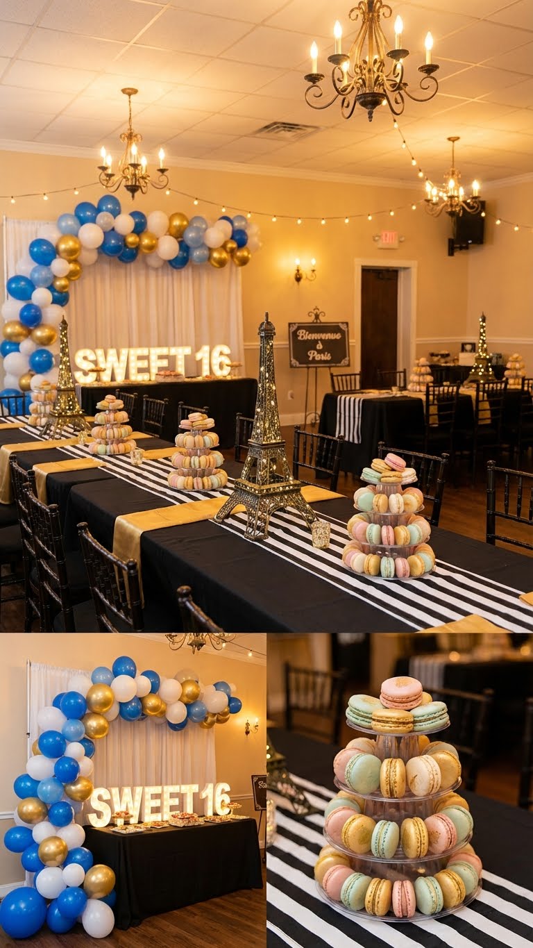 Metamorphose your sweet 16 birthday into a fun and festive evening with live accordion music and Eiffel Tower décor.
