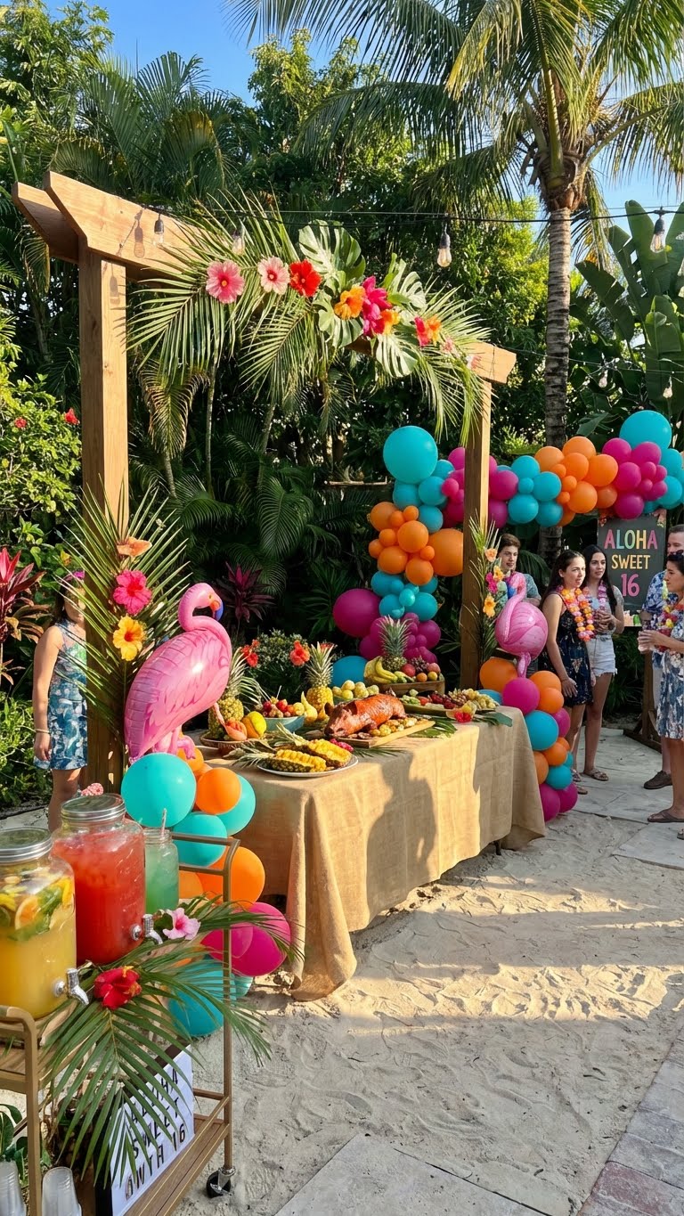 Swaying palm trees and gentle ocean breezes set the scene for your ultimate Tropical Paradise Luau Sweet 16. Alter your space with luau-themed décor, including floral leis and inflatable flamingos. Create a beachy atmosphere by spreading white beach sand across designated areas.