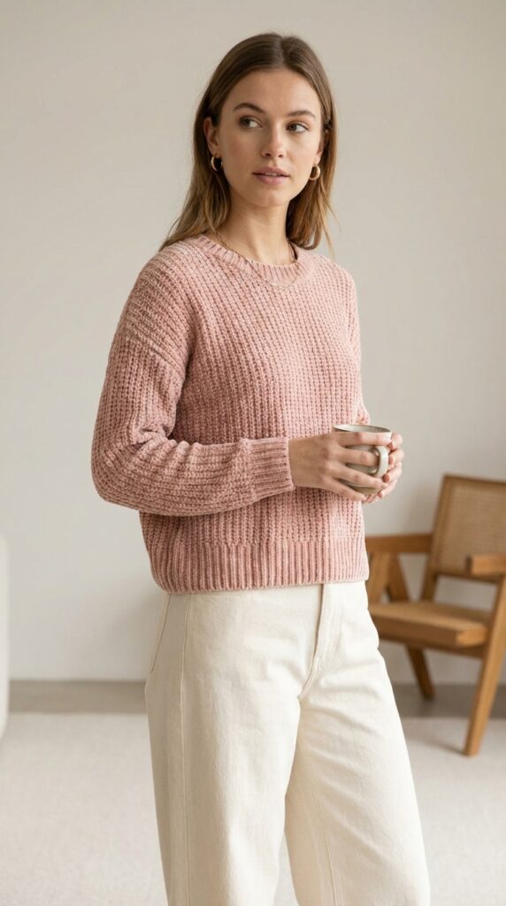The chenille sweater’s plush texture creates an instant focal point while keeping you warm during those chilly celebrations. I love how wide-leg trousers balance the sweater’s fitted silhouette – they’re surprisingly flattering on most body types and give you room to move comfortably.