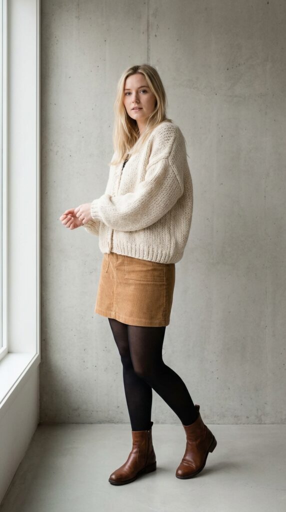 Your mini skirt should hit mid-thigh for the most flattering proportions. Accessorizing with tights becomes essential here—opt for opaque black or patterned styles to add personality. Complete the look with ankle boots or knee-high boots, depending on your height preference and comfort level.