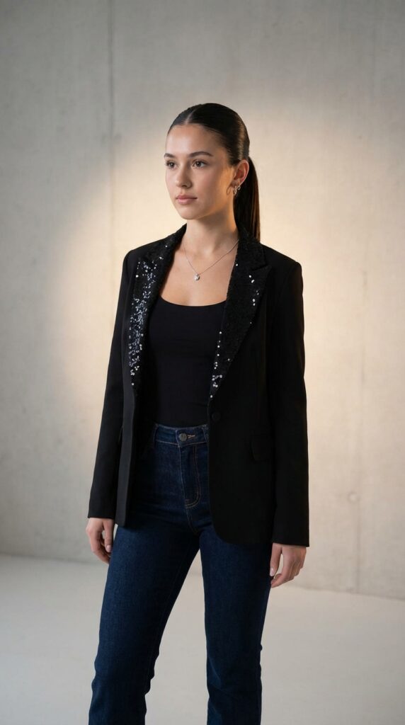 Dark wash jeans provide the ideal foundation – they’re dressier than light denim but won’t compete with your blazer’s sparkle. The contrast creates a balanced silhouette that’s sophisticated yet age-appropriate.