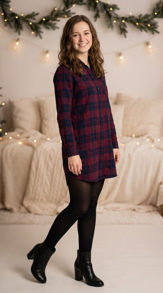Cozy sophistication meets birthday-ready style when you slip into a plaid mini dress paired with opaque tights and ankle boots. This classic combination never fails to deliver that perfect balance of cute and put-together.