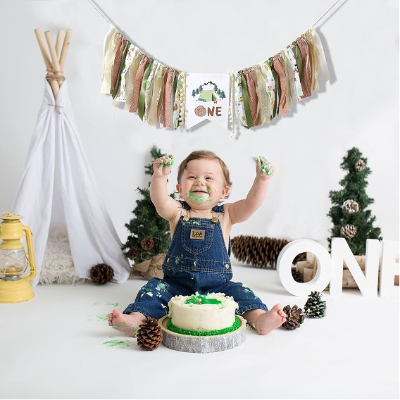 With the large “ONE” letters next to him, the baby looks curious and captivated by the colorful scene, making this a perfect setting for a first birthday photoshoot. The natural background completes the scene with a peaceful outdoor vibe.