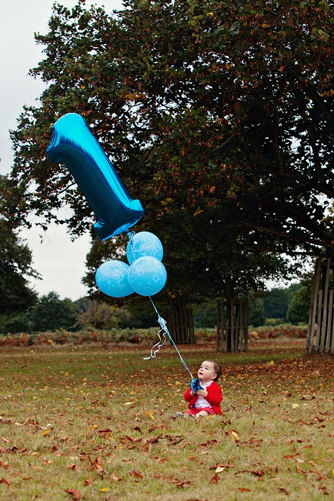 In this beautiful outdoor shot, a baby boy sits in his highchair with blue balloons surrounding him. The sign that reads “I’m ONE YEAR OLD” adds to the charm of the scene. The lush, green outdoor setting, with its natural beauty, creates a peaceful and joyful atmosphere for the birthday shoot. The baby’s expression adds just the right touch of innocence and joy, making it the perfect way to mark this significant milestone.