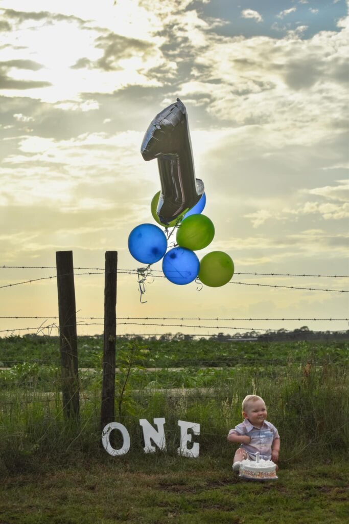 The large, floating balloon with a number “1” adds an extra dimension to the scene, and the vibrant blue and green colors contrast wonderfully with the soft, golden hues of the sunset. This outdoor farm-inspired theme makes for a picture-perfect memory.