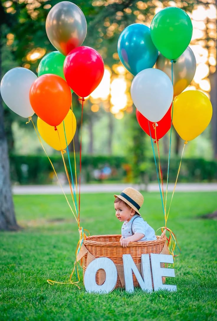 This colorful image showcases a baby boy in a basket, surrounded by bright, vibrant balloons. His adorable smile and stylish outfit complement the playful vibe of the balloons. The soft lighting and natural setting in the background create a beautiful contrast with the colorful decor. This playful and simple photoshoot is sure to be a cherished memory.