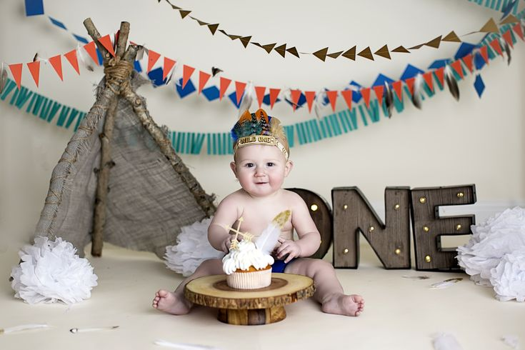 In this delightful scene, a baby boy dons a charming feathered crown, adding a touch of tribal flair to his first birthday shoot. He sits excitedly in front of a delicious cupcake on a wooden pedestal, while colorful banners and flags adorn the background. The “ONE” sign, glowing with light bulbs, makes the moment extra special. The feather accents and earthy tones create a whimsical, nature-inspired theme that’s perfect for celebrating a baby’s first milestone.