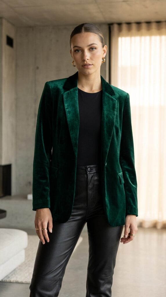 Choose a deep jewel-toned blazer in emerald, burgundy, or midnight blue. These colors photograph beautifully and work with most skin tones. For your leather pants, stick with classic black for maximum versatility.