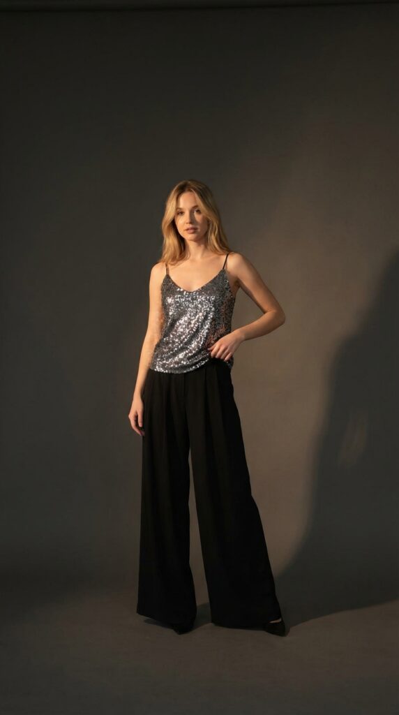 The layered textures add depth that photographs beautifully under party lighting. Choose sequined pants in gold, silver, or deep jewel tones, then pair them with a silk camisole in a complementary shade.