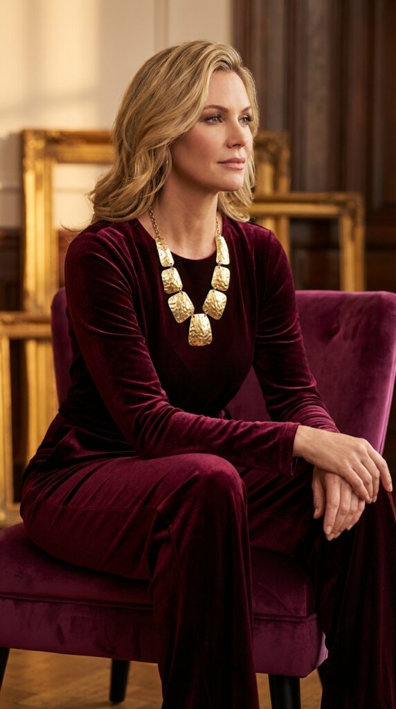 The magic happens when you pair velvet textures with the right accessories. A chunky statement necklace in gold or silver creates the perfect focal point against that rich burgundy backdrop. I’ve found that geometric designs work particularly well—they add modern edge to velvet’s classic sophistication. For a grown-up elegance, this outfit idea is perfect for your 27th birthday celebration.