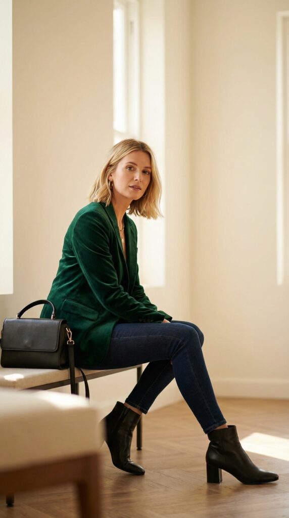 Luxe Velvet Blazer With Dark Denim and Ankle Boots