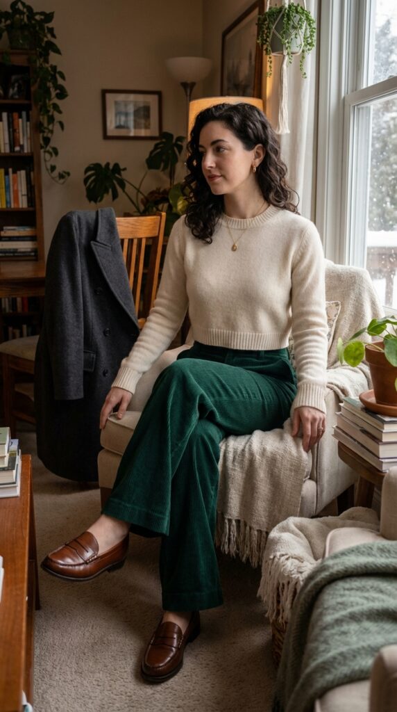 Corduroy Wide-Leg Pants With Cropped Sweater and Loafers