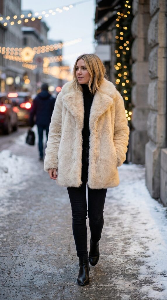 Start with black skinny jeans, a fitted black top, and sleek ankle boots. This foundation lets your coat shine as the star. The faux fur texture adds luxury and visual interest that photographs beautifully – essential for birthday posts. Bold black winter birthday outfits can also create a classic, sleek look for your special day.