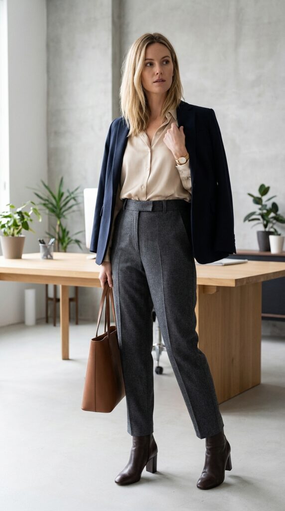 Layering techniques become pivotal in winter weather. I’ll add a tailored blazer or wool coat that complements the trouser color. The heeled booties ground the look while adding height—choose leather or suede in neutral tones.