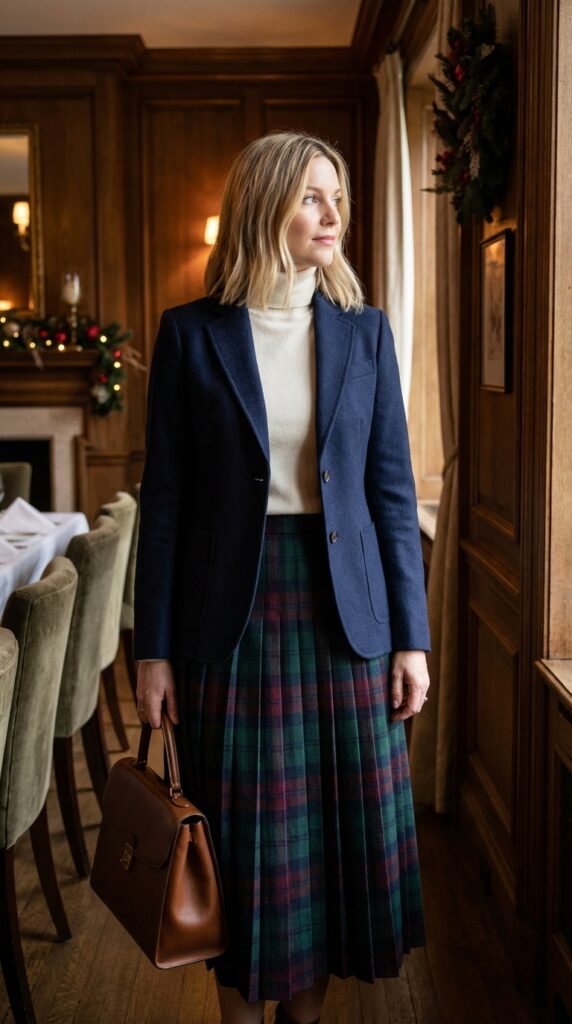When you want to channel sophisticated preppy vibes for your 28th birthday, this three-piece combination delivers effortless elegance. The plaid midi skirt serves as your foundation—opt for classic tartans in burgundy, navy, or forest green that complement winter’s rich palette.