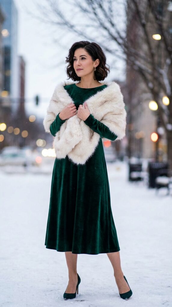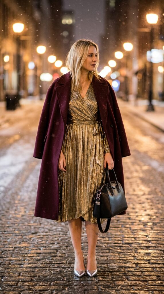 A wrap dress works beautifully because it’s universally flattering and adjustable. You’ll want to choose a midi or maxi length for warmth and sophistication. The metallic sheen catches light from every angle, creating stunning photos that’ll make your social media shine.