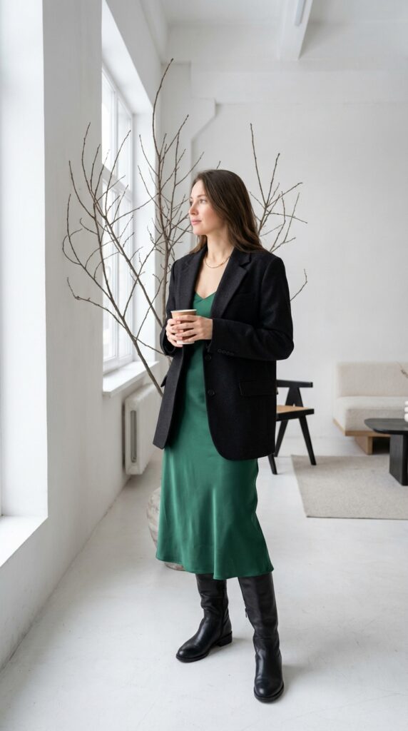 This sophisticated pairing offers the best of both worlds – feminine elegance meets practical warmth. Choose a midi-length silk slip in jewel tones like emerald or sapphire, then add a customized wool blazer for structure and insulation.