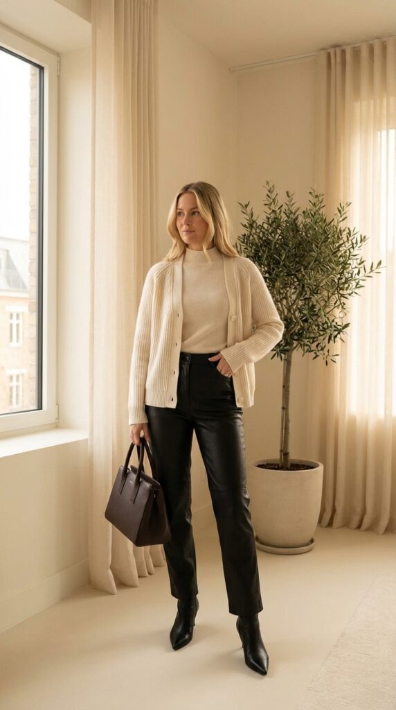 Leather pants versatility really shines here – they instantly enhance your sweater from casual to celebration-ready. Choose high-waisted styles to create a flattering silhouette that pairs perfectly with cropped cardigans or fitted turtlenecks.