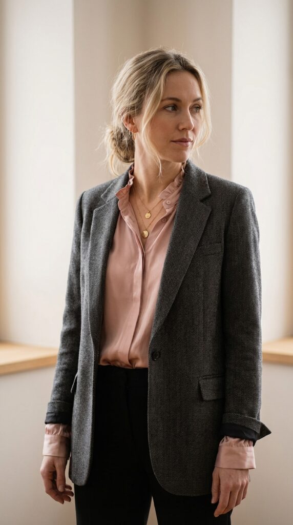Start with a silk blouse in cream or blush – these colors photograph beautifully against darker blazers. Choose a structured wool blazer that fits your shoulders perfectly. The contrast between silk’s fluidity and wool’s structure creates visual interest that’s simply stunning.