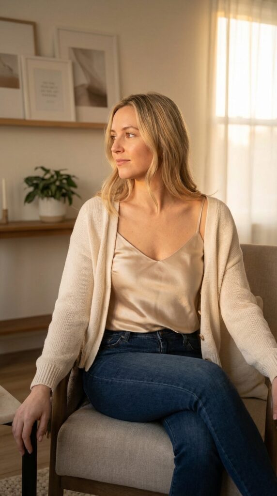 Three wardrobe staples come together in perfect harmony when you layer a satin camisole with a cardigan and jeans—it’s the kind of effortless outfit that looks like you spent way more time planning than you actually did.