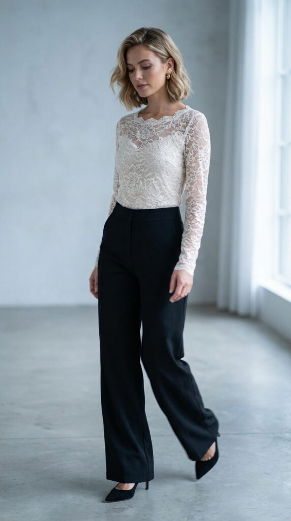 When you want to step up the graceful factor while staying comfortable, a lace long-sleeve top paired with wide-leg pants creates that perfect balance between feminine and relaxed.