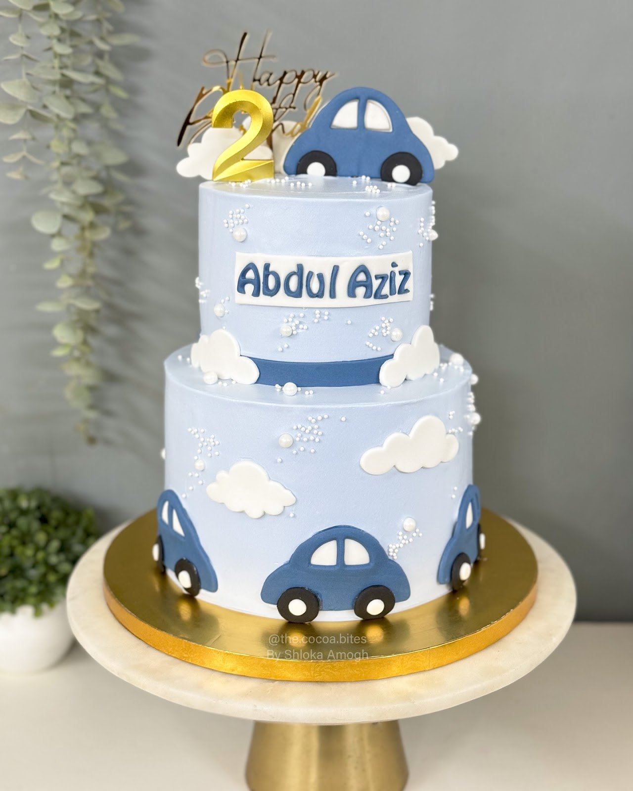 This cake features cute blue cars driving around the base, with fluffy white clouds above. The addition of a golden “2” on top brings an extra special touch, making it perfect for a second birthday celebration.