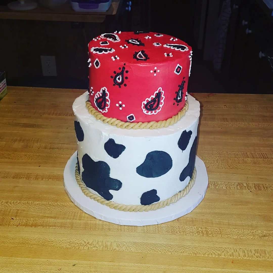 This two-tier cake features cow print on the bottom tier and a red bandana design on top, perfect for a western or cowboy-themed birthday. The rope decoration around the tiers completes the rustic look.