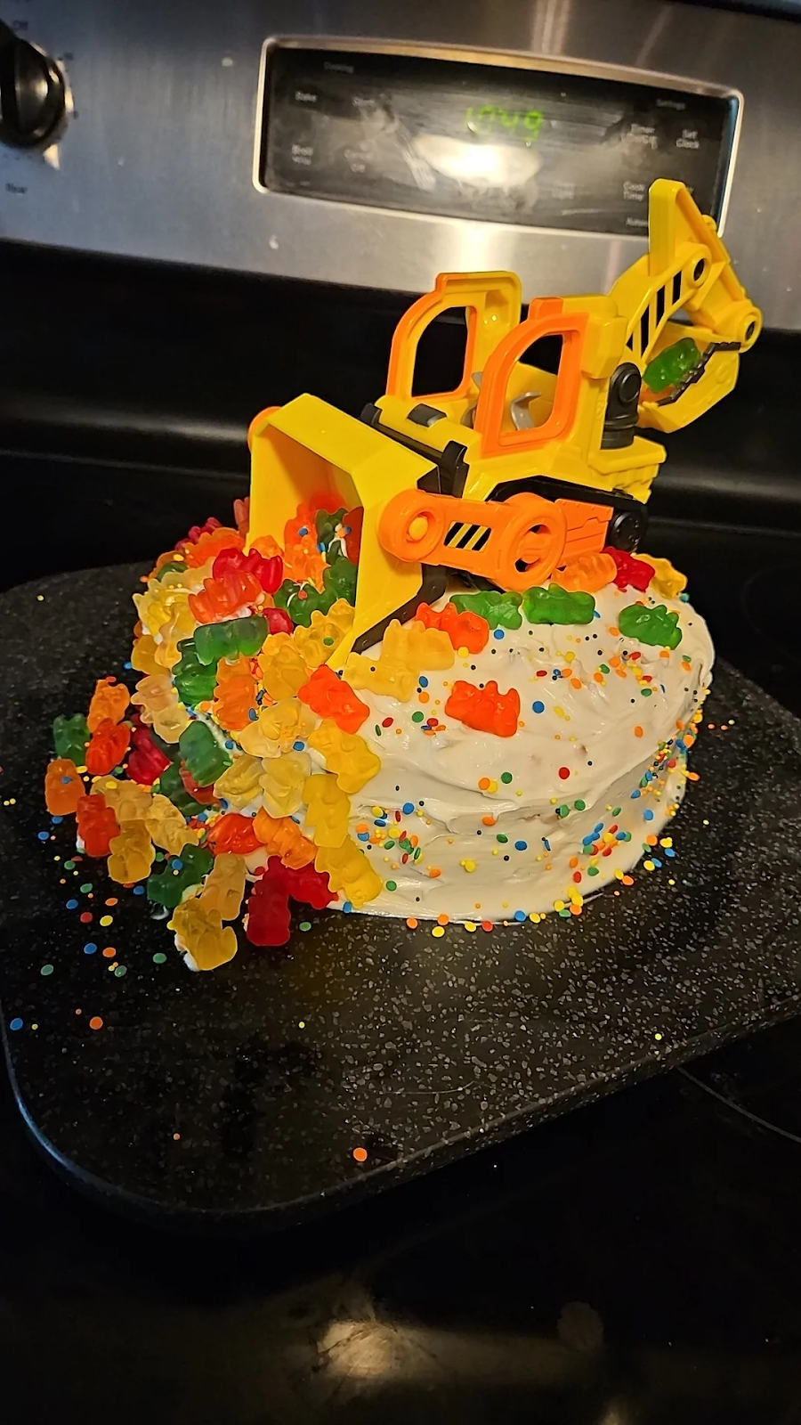 This fun construction-themed cake features a bright yellow excavator toy spilling colorful gummy bears. It’s a creative and playful design that adds an interactive element to the party, letting kids engage with the cake.