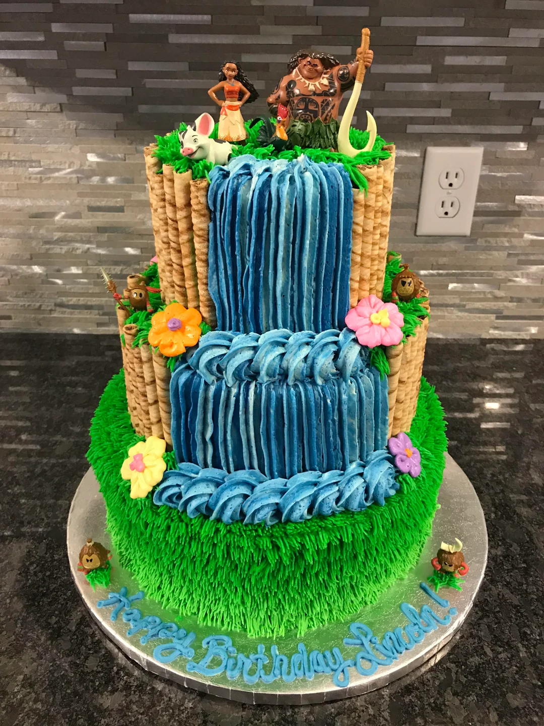 Inspired by the Moana movie, this cake features a beautiful waterfall design with cascading blue icing. The tropical vibe is enhanced by vibrant greenery and colorful flowers around the cake’s base, making it truly enchanting.