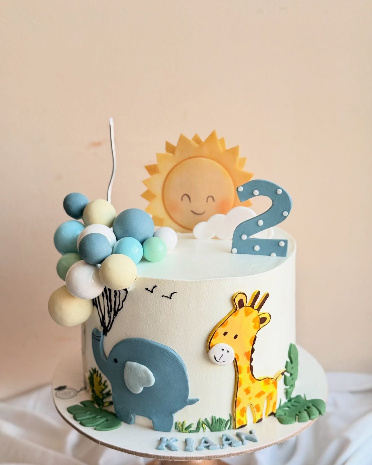 Featuring a cute elephant and giraffe, this cake is a nature lover’s dream. The soft pastel colors and sunny decorations create a cheerful, animal-themed atmosphere for a birthday celebration.
