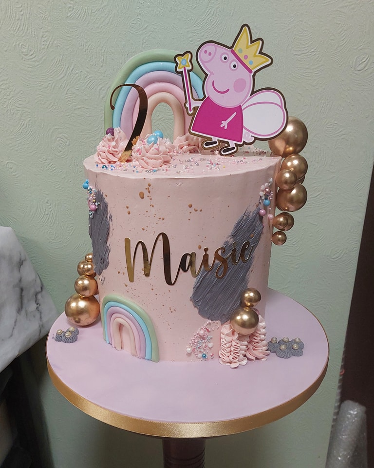 A stunning cake adorned with a rainbow and the beloved Peppa Pig character, this design is perfect for a little one’s special day. The soft pink tones and fun golden decorations create a perfect blend of elegance and playfulness. The addition of whimsical rainbow colors brings a light, magical touch to the birthday celebration.
