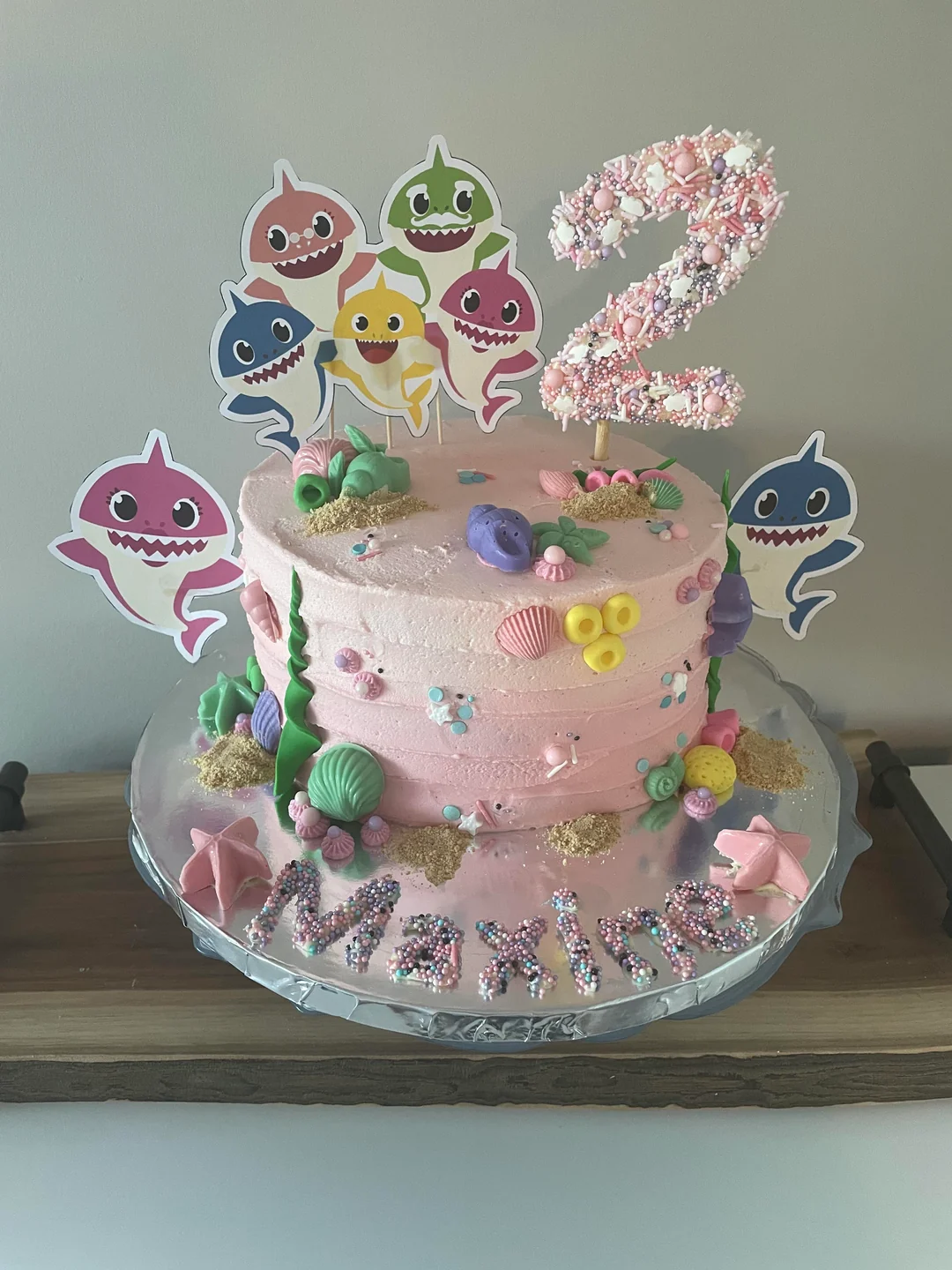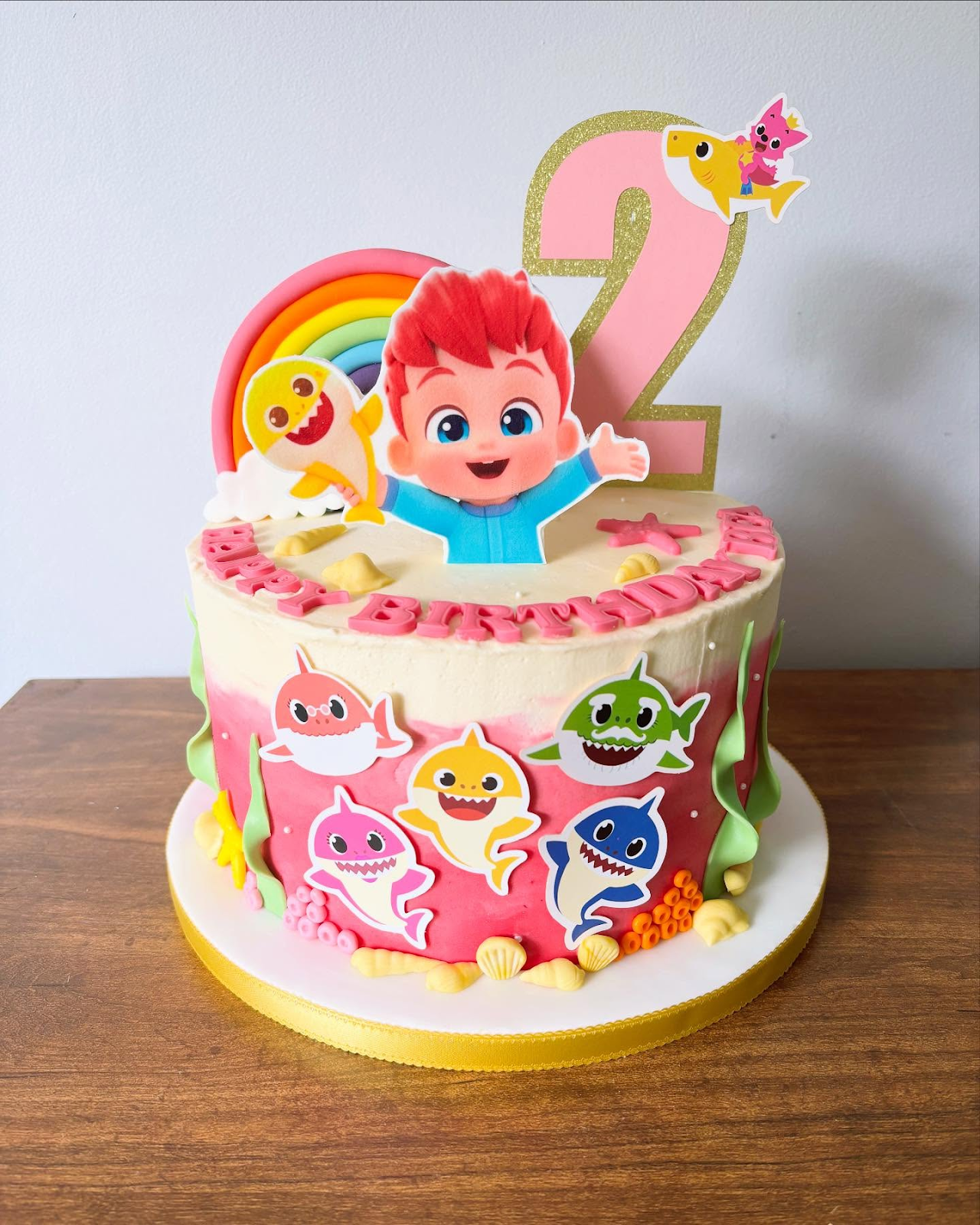 This delightful shark cake features colorful shark characters and ocean-themed decorations. The cake is topped with a vibrant “2” and surrounded by playful sea creatures. The soft pink frosting and colorful seashells, candy, and seaweed details create a cheerful and whimsical look, perfect for a birthday party.