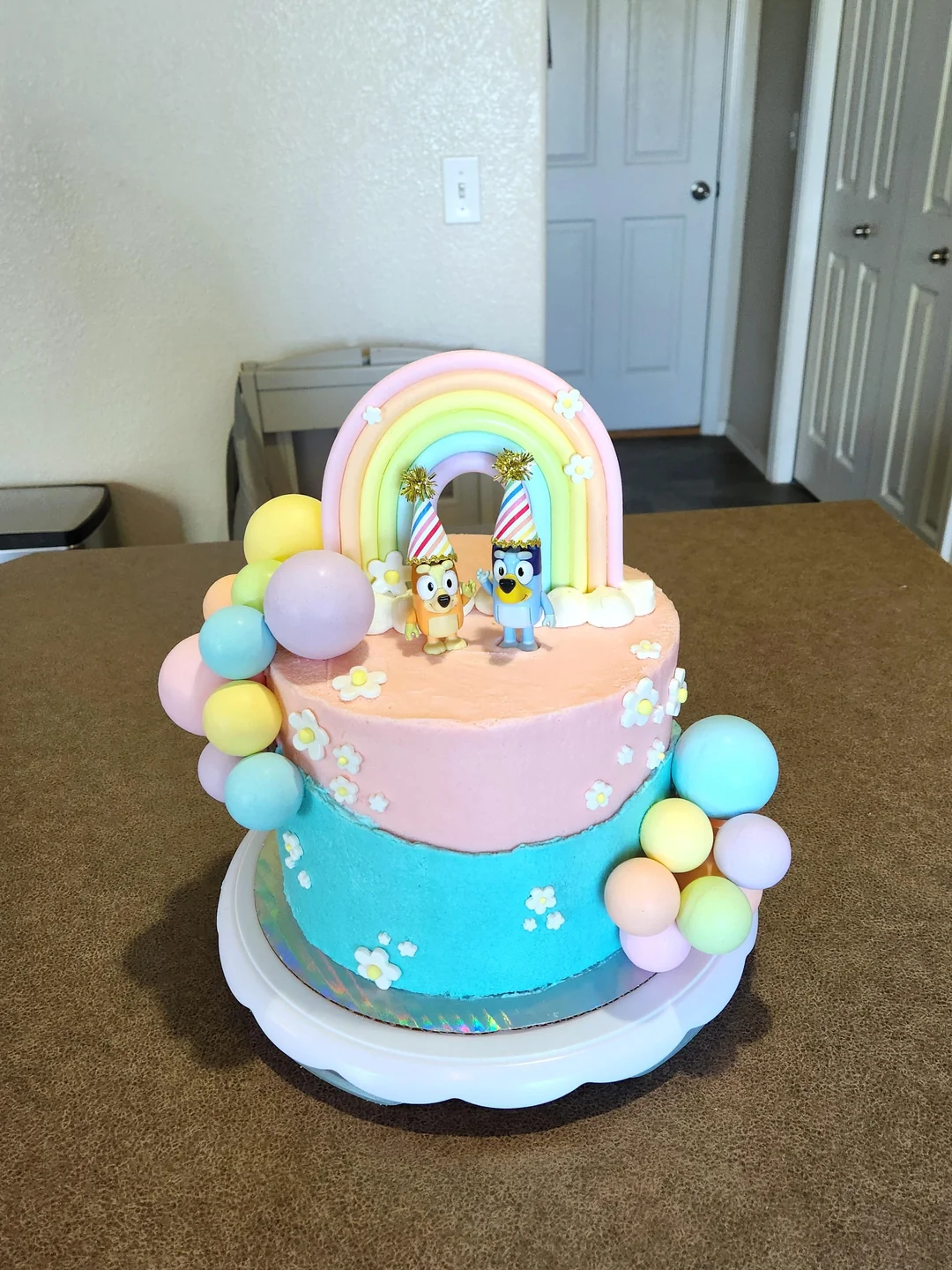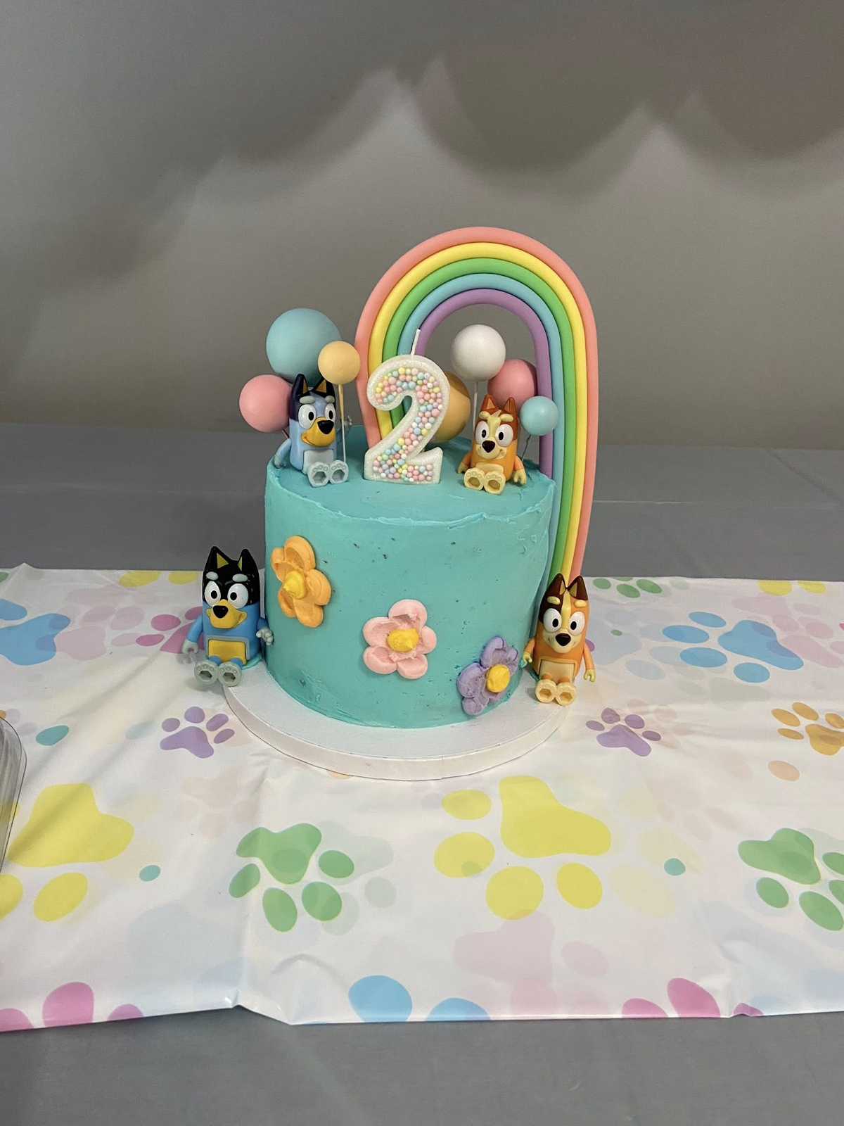 The playful “2” topper in rainbow colors adds a special touch, making it ideal for a fun-filled birthday celebration. This cake brings a sense of joy and adventure to the party.
