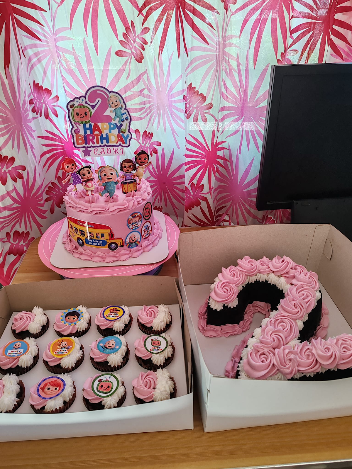 This adorable birthday setup features a vibrant cake with LOL Doll figurines, along with matching cupcakes. The playful design, with its bright pink colors and fun character designs, creates an exciting and festive atmosphere for a 2nd birthday party. The large “2” topper on the cake adds a personal touch, making it stand out.