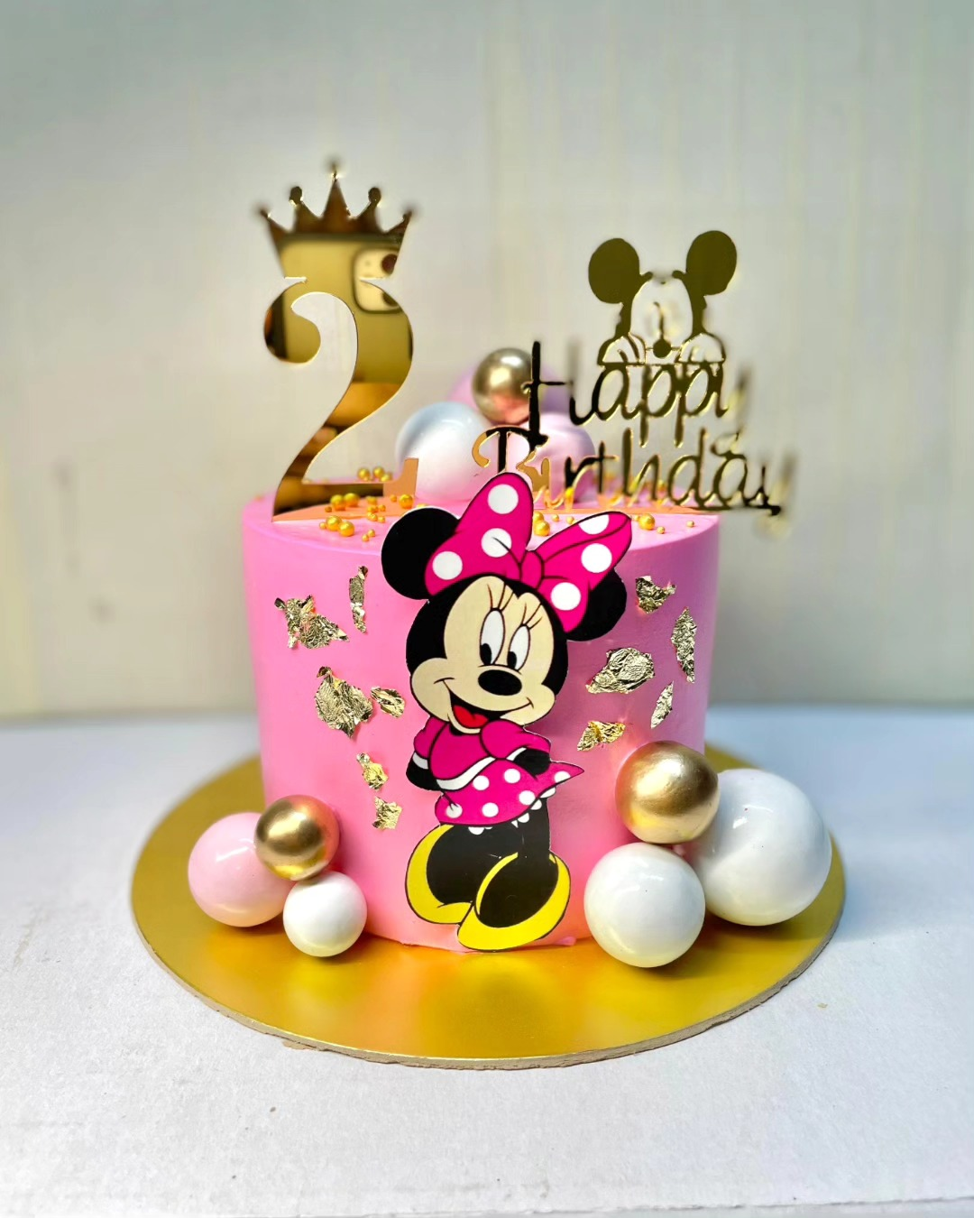 A sweet and stylish Minnie Mouse cake for a 2nd birthday celebration, featuring gold accents, a bold Minnie illustration, and playful spheres around the base. The soft pink backdrop and gleaming gold decorations give this cake a sophisticated yet playful feel, perfect for a little girl’s special day.
