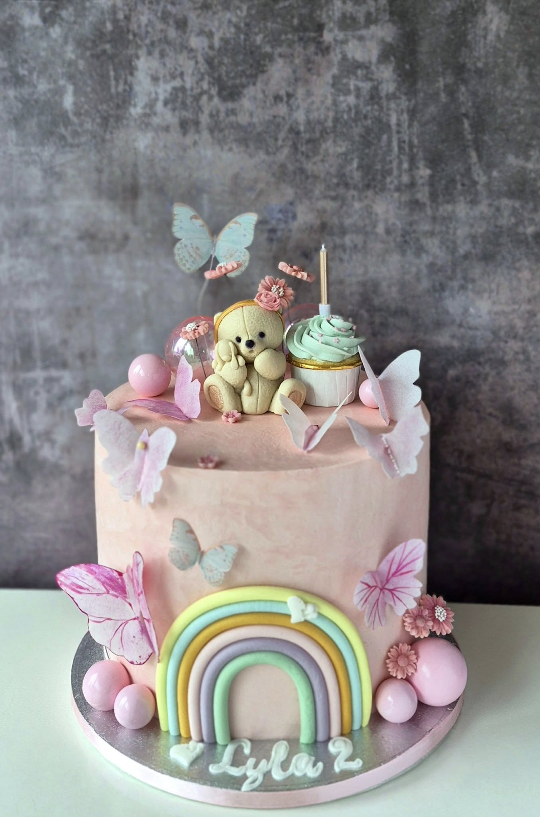This enchanting birthday cake features soft pastel colors, delicate butterflies, and a cute bear figurine, creating a dream-like aesthetic. The rainbow-shaped fondant adds a pop of color, while the soft floral accents bring a touch of elegance. It’s perfect for a baby girl’s second birthday, capturing a sense of whimsy and charm.