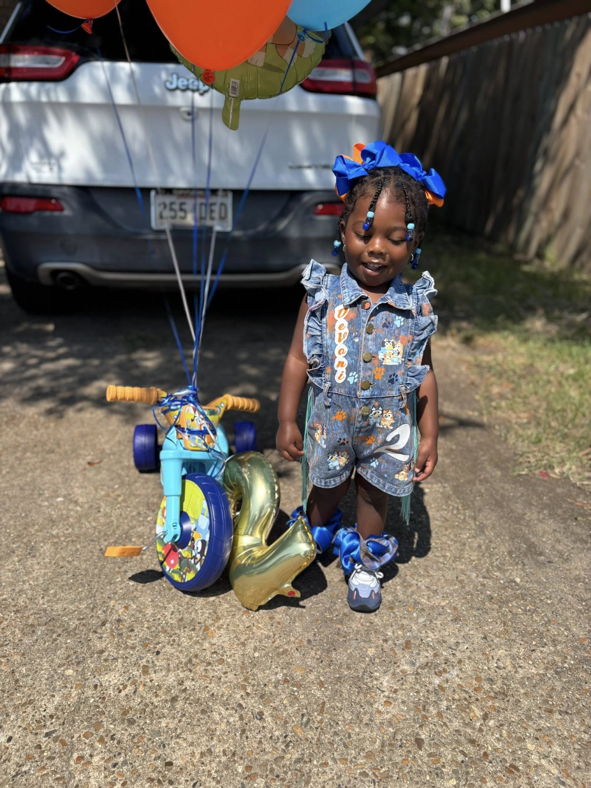 Fun Denim Outfit with Colorful Balloons and Tricycle