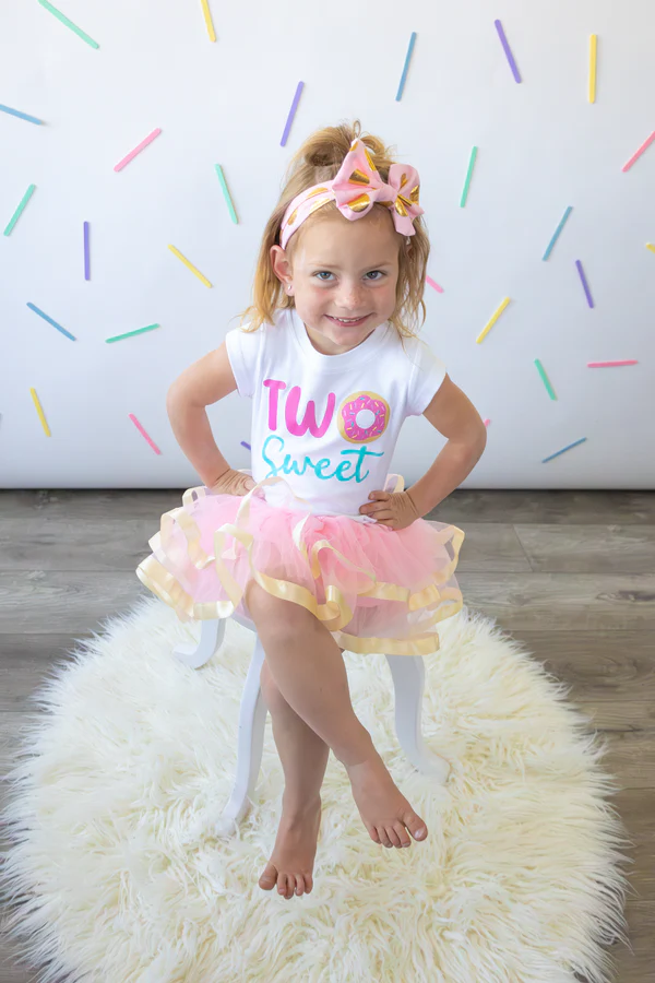 This playful “Two Sweet” t-shirt with a donut design is paired with a soft pink tutu skirt, making it a sweet and fun outfit for a second birthday party. The bright colors and cute donut theme add a playful touch to the outfit, while the fluffy skirt keeps her looking adorable and feeling comfortable.