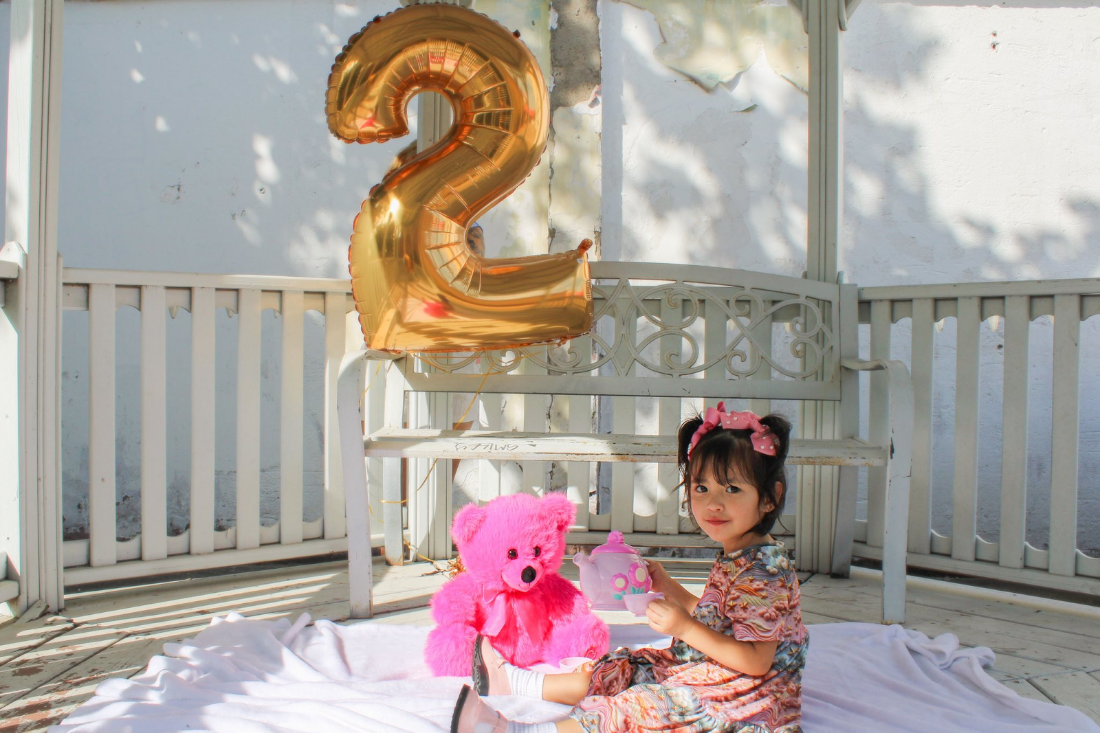 The golden “2” balloon adds a special touch to this picture-perfect moment, capturing the essence of childhood joy. The little shoes and the colorful hair bows tie everything together, creating a cohesive look for this milestone moment.