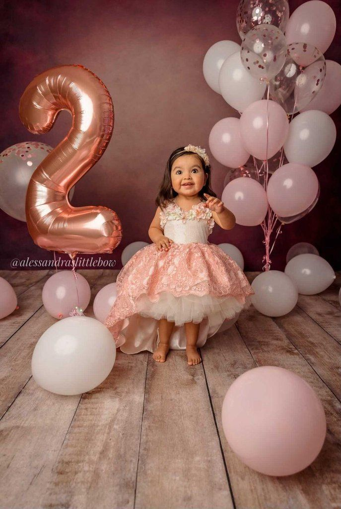 This stunning pink dress with delicate lace detailing is perfect for a second birthday celebration. Paired with a soft pink headband, it’s the ideal choice for a more formal celebration. The backdrop of pink balloons adds to the dreamy vibe, making it a picture-perfect moment to capture.
