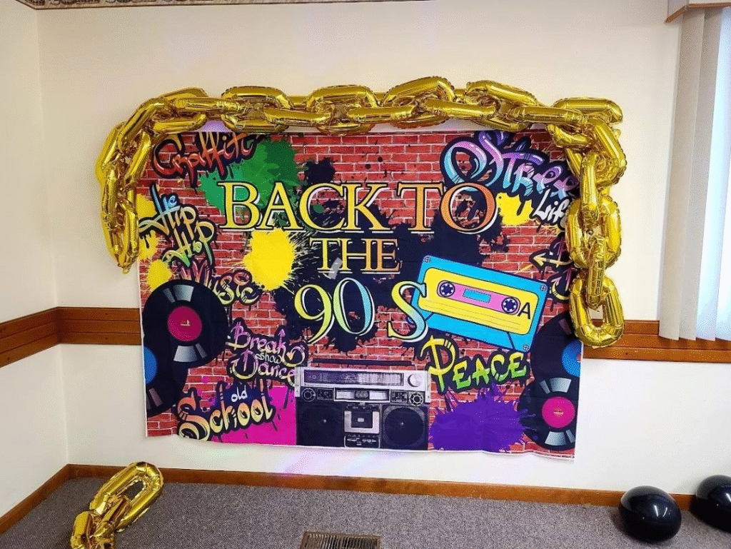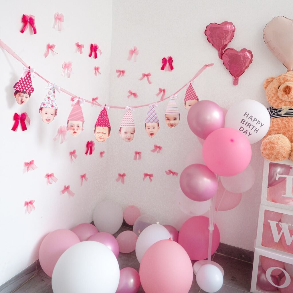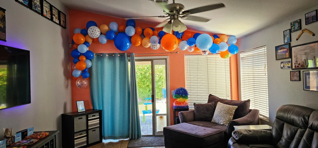 Change your space with lively decorations, striped banners, and colorful balloons.