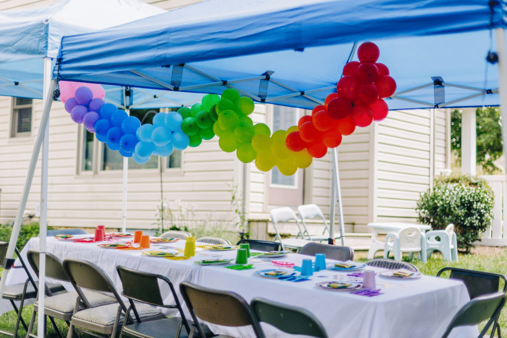 Alter the party space with vivid balloons and shimmering streamers, then delight guests with rainbow cupcakes and colorful treats.
